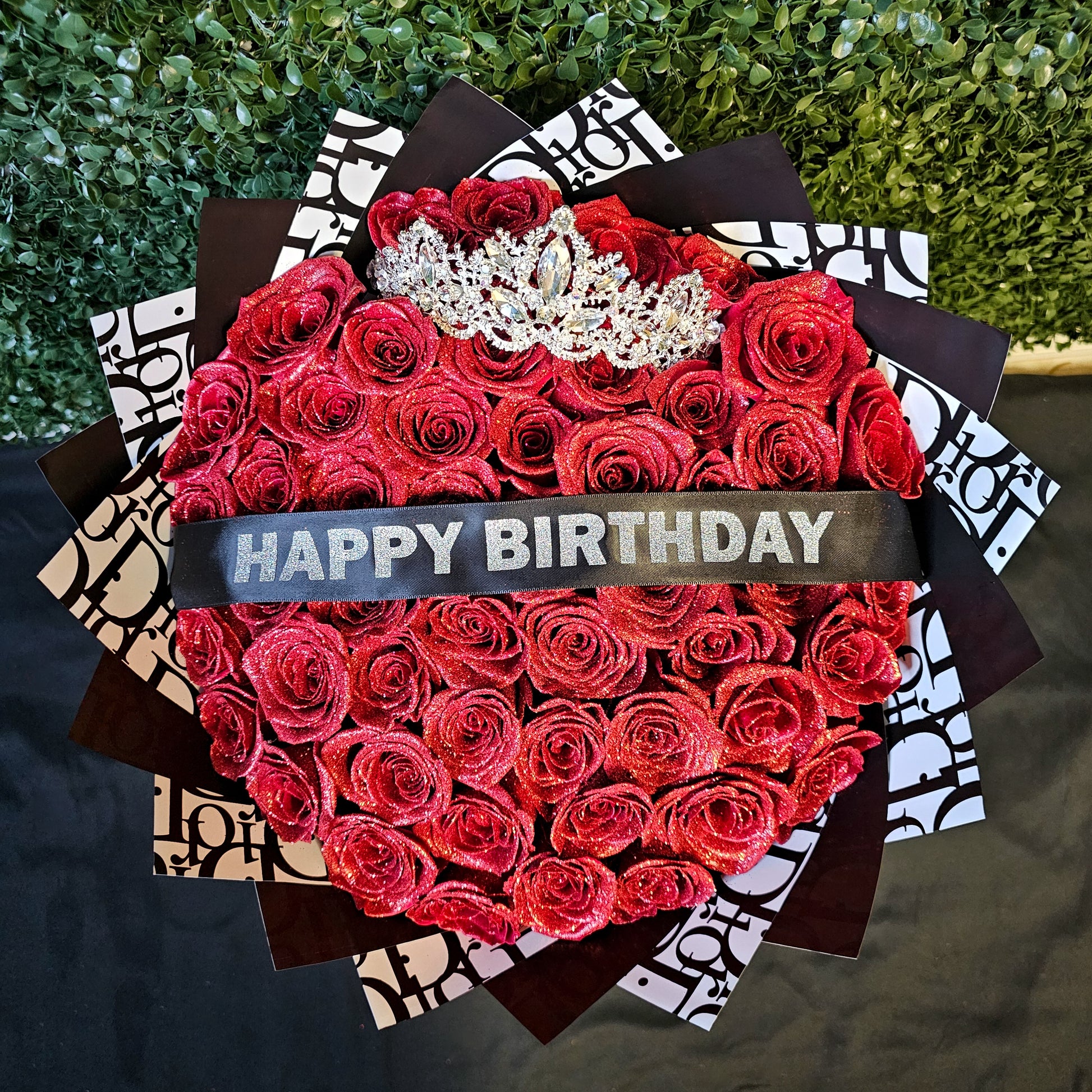 Shower your loved one with birthday love and sparkle with our Birthday Girl bouquet. The glittering red roses are adorned with a silver crown, and the personalized sash adds a special touch to celebrate their special day. No doubt, this gift screams HAPPY BIRTHDAY!"